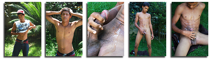 The piss continues to flow out of dark uncut cocks this week! Humberto is the 18 year old little brother of Enrique (the previous model) and he came along with him to the photo shoot...they are sort of competitive as brothers tend to be so he asked if we would shoot him. He told us that he's got a big cock like his older brother. Of course, we said, yes, so you get to enjoy watching a hot 18 year old pissing for the very first time just like his older brother (who is watching the entire time)! Guess he was really horny because he busts his nut 2 times!